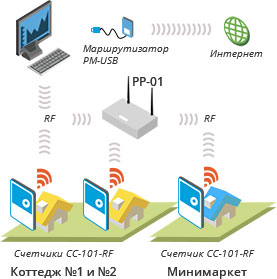 Маршрутизатор РМ-01 необходимо устанавливать так, чтобы обеспечить максимальный охват наибольшего количества точек учета. В поселке может устанавливаться один или несколько маршрутизаторов РМ-01, в зависимости от количества строений и их расположений. При больших расстояниях (>100м) используется радиоретранслятор РР-01.